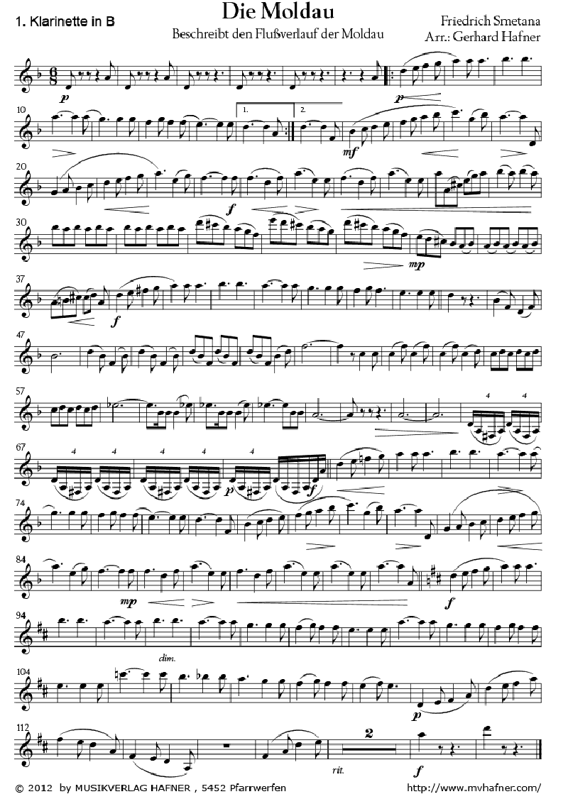 Beschreibung Zunächst stellt Smetana die Quellen vor, die von zwei Flöten dargestellt werden. Im weiteren Verlauf wird das Hauptmotiv der Moldau von den Streichern gespielt und dann vom gesamten Orchester übernommen. Im Anschluß daran ertönt im Wald eine Jagdszene, die durch den Klang der Hörner gekennzeichnet ist. Die Moldau windet sich weiter und fließt an einer Bauernhochzeit auf dem Lande vorbei. Man kann dabei die fröhlichen Tänze der Hochzeitsgesellschaft im Hauptmotiv hören. Inzwischen ist es Nacht geworden und der Fluß fließt im hellen Licht des Mondscheins an zarten Nymphen vorbei, die einen Reigen tanzen. Danach erscheint wieder das Hauptmotiv der Moldau, die nun zu einem breiten Strom geworden ist. An den Sankt Johann Stromschnellen erreicht die Spannung ihren Höhepunkt. Paukenschläge und laute Blechbläser verdeutlichen die Gefahr der vielen Stromschnellen und des bedrohlich rauschenden Wassers. Nach den Stromschnellen ist die Moldau wieder zur Ruhe gekommen und strömt nun breit dahin. Zum Schluß erscheint das Vysehrad-Motiv bevor die Moldau an der Mündung den Blicken entschwindet.