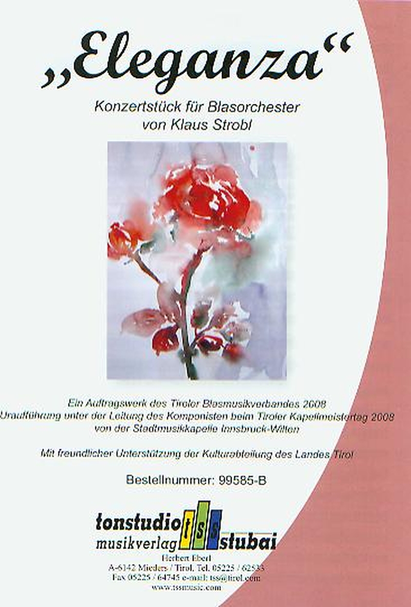 Das fulminante Konzertwerk Eleganza des Tiroler Komponisten Klaus Strobl glänzt sowohl in seinen ruhigen als auch in seinen pompösen Teilen. 2008 als Auftragswerk des Tiroler Blasmusikwerks entstanden wurde Eleganza bald im ganzen Land und darüber hinaus gespielt.