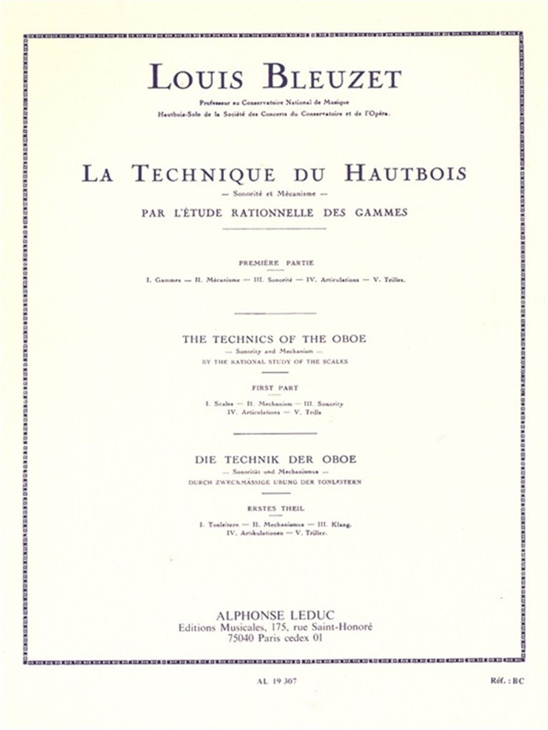 The Techniques of the Oboe, Sonority and Mechanism by Louis Bleuzet is a method for oboe, using the rational study of the scale. This first volume for beginners includes the following topics: 1. Scales 2. Mechanism 3. Sonority 4.Articulations 5. Trills. The two other volumes focus on: Scales in third, Mechanism, Scales in fourths, Mechanism, Whole tone scales, Chromatic scale, Arpeggios and Staccato. Louis Bleuzet (1874-1941) was a French oboist and aprofessor at the Paris Conservatoire.