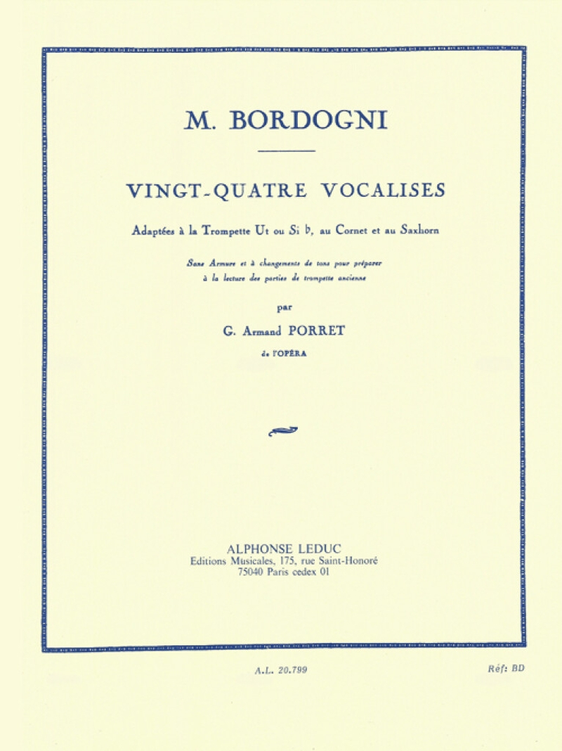 Der italienische Operntenor Marco Bordogni (1789-1856) feierte große Erfolge als Sänger und Lehrer, als er nach Paris zog. Seine Vingt-Quatre Vocalises sind so populär geblieben, dass G. Armand Porret die Notwendigkeit sah, die Studien für Blechblasinstrumente zu bearbeiten. In Porrets Bearbeitung, die auf C oder B einstellbar ist? Trompete, Kornett und Saxhorn, ist eine praktische Transpositionstabelle beigefügt. Die Vingt-Quatre Vocalises ermöglichen es dem Interpreten, sich auf Ton, Lyrik, Artikulation, dynamische Kontraste, Fingersatz und Atemkontrolle zu konzentrieren, neben anderen wichtigen Aspekten. Da die Vingt-Quatre Vocalises sehr vielseitig sind und seit mehr als zwei Jahrhunderten ein beliebtes Hilfsmittel für Vokalisten und Instrumentalisten darstellen, ist es klar, dass die Vingt-Quatre Vocalises, angepasst für C- oder B? Trompete, Kornett und Saxhorn, ein wichtiges Hilfsmittel für die Entwicklung eines Interpreten sein würde.