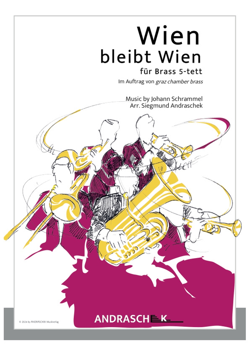 Im Rahmen der langjährigen Zusammenarbeit mit dem Ensemble graz chamber brass sind zahlreiche Bearbeitungen für Brassquintett entstanden. Für das Wiener Programm dieses Ensembles wurde auch u.a. vorliegende Bearbeitung von Wien bleibt Wien in Auftrag gegeben. Dieser schwungvolle Marsch von Johann Schrammel (1850-1893) darf mit Recht als „must have“ für das perfekte Konzertprogramm bezeichnet werden. Ein wunderbares Stück auch für die musikalische Untermalung festlicher Anlässe – hier in der Besetzung für: 2 Trompeten, Horn, Bariton und Tuba.